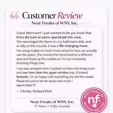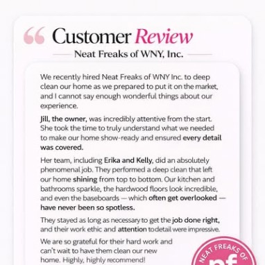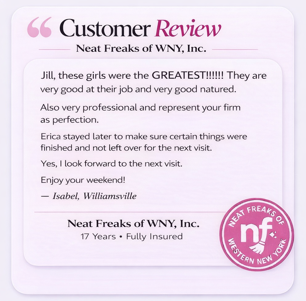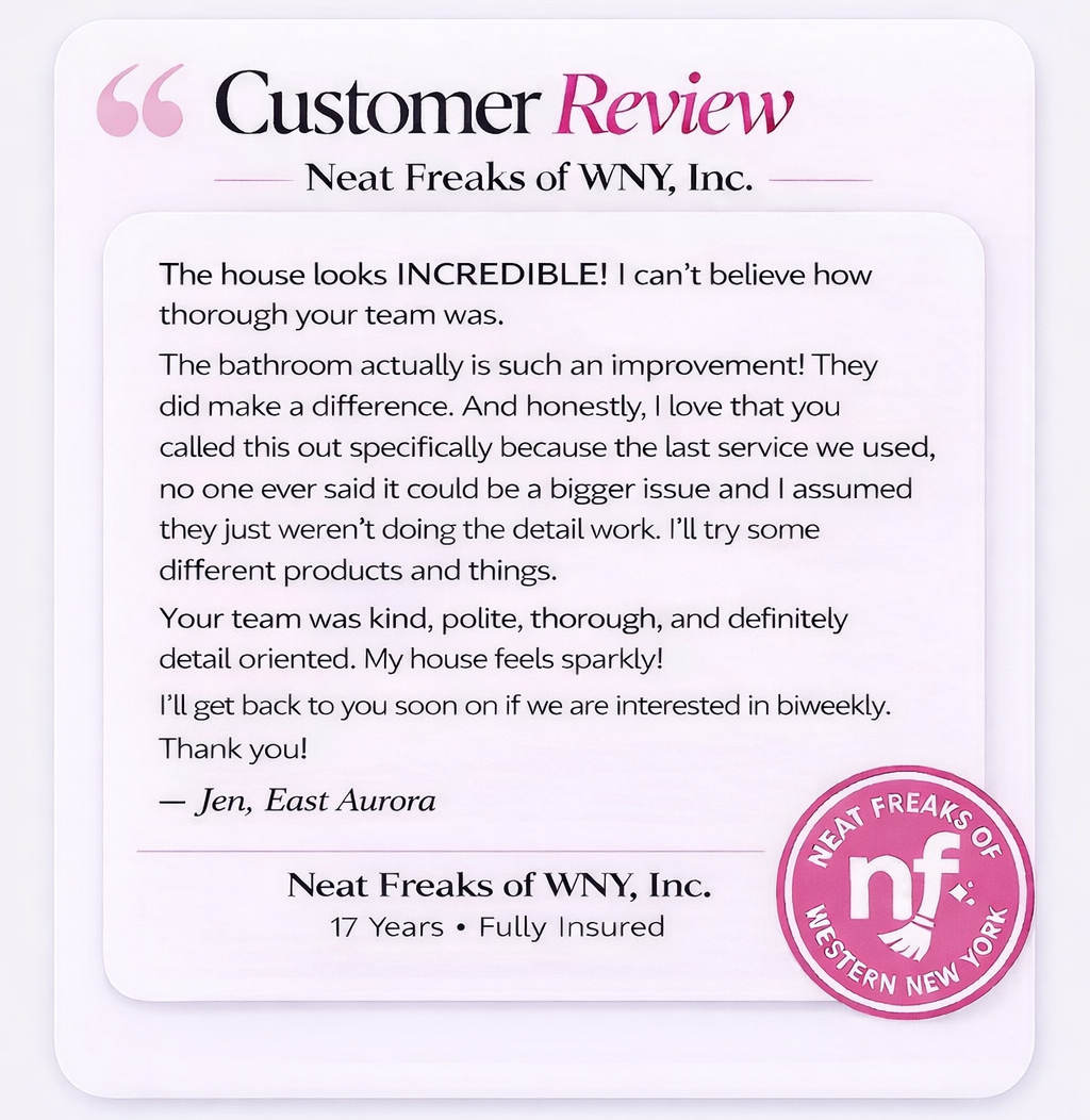 Our team of professional cleaners are employees — never independent contractors — ensuring consistent standards, ongoing training, and unmatched reliability. At Neat Freaks of Western New York, we pride ourselves on reliability, integrity, and professionalism. We offer free estimates, flexible scheduling, and service that exceeds expectations.